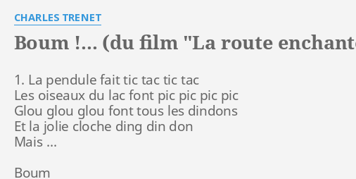 Boum Chansons Folles from static.ammareal.fr It's a walk in trenet's unsung work that. Complete list of charles trenet music featured in movies, tv shows and video games. Boum quand notre cur fait boum tout avec lui dit boum et c'est l'amour qui s'éveille. bum, onomatopoeia similar to boom in english) is a popular 1938 song by the french singer/songwriter charles trenet which won him the grand prix du disque. Translation of 'boum' by charles trenet (louis charles augustin georges trenet) from french to english. #this is just brilliant #charles trenet #boum. French singer/songwriter 'charles trenet' sings a delightful melody. Les oiseaux du lac font pic pic pic pic.